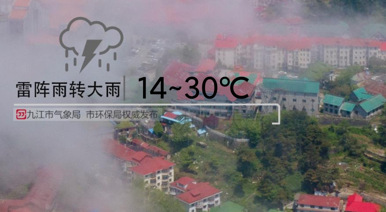 九江气象台4月11日早晨发布:今天白天到晚上,雷阵雨转大雨,14~30℃,明天白天到晚上,阴转多云。