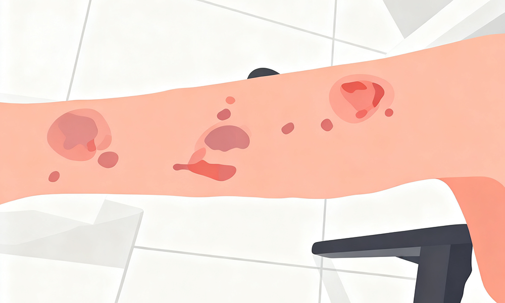在没有外伤或挤压的情况下,出现难以解释的常规换药不愈合的皮肤溃烂。