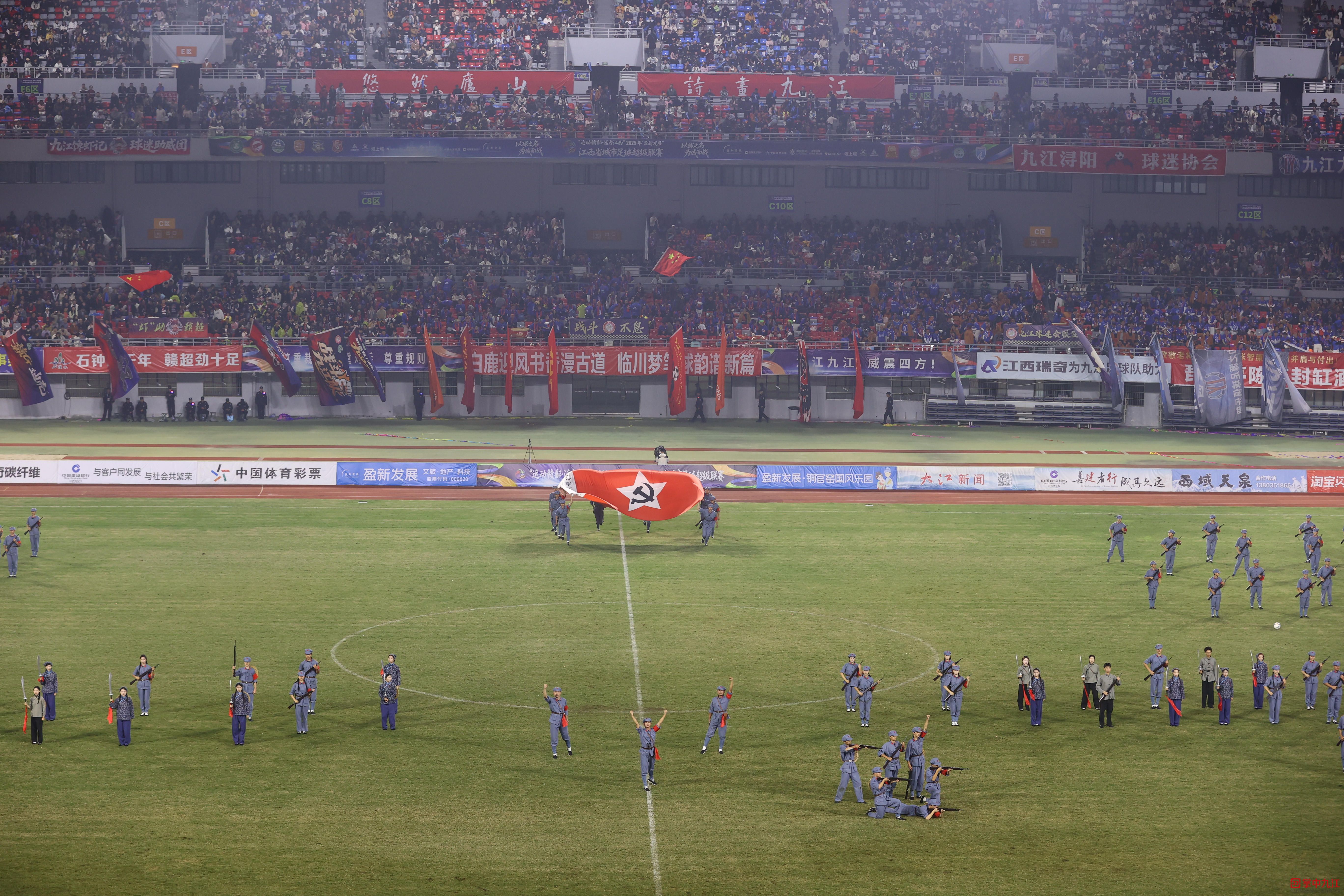 星点闪烁,起舞绿茵。10月26日晚,赣超联赛九江最后一场主场文艺演出在市体育中心球场盛大启幕,演职人员用精彩的表演书写了一段传承红色文化与足球信仰的动人篇章。