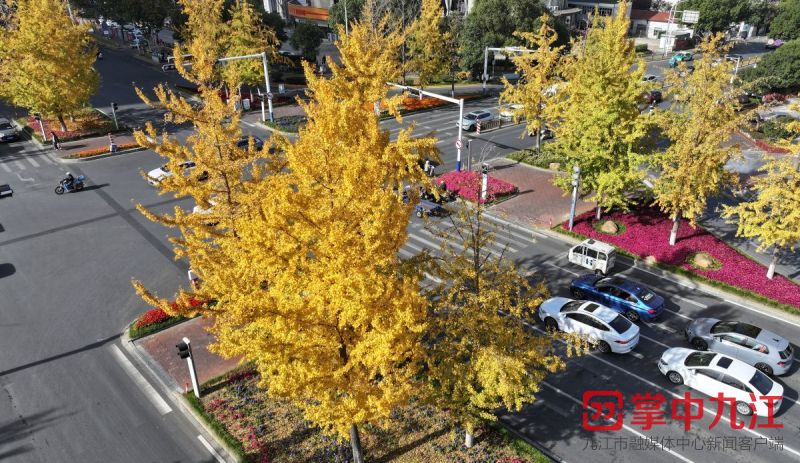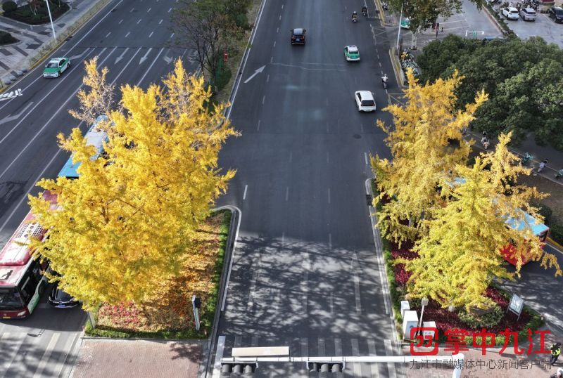 近日,随着冷空气带来的气温下降,我市城区多处银杏树纷纷换上“金装”,进入一年中最富诗意的观赏时节。图为11月25日,浔南大道与金凤路交叉口处“围成一圈”的银杏树枝繁叶茂,金黄的银杏叶在阳光的照射下熠熠生辉,市民漫步街头,不经意地抬头便能领略这份属于初冬的限定美景。