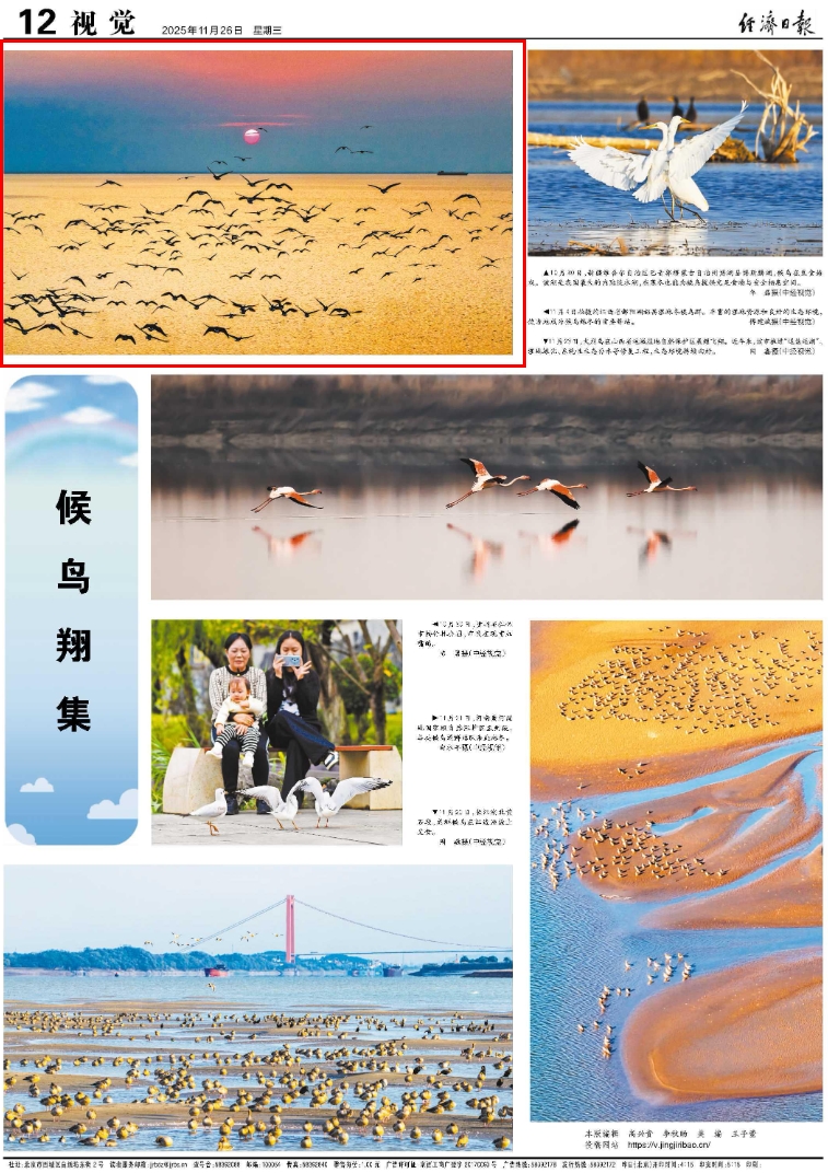 11月26日,《经济日报》12版视觉版刊发图片,报道11月4日拍摄的江西省鄱阳湖都昌湿地冬候鸟群。丰富的湿地资源和良好的生态环境,使当地成为候鸟越冬的重要驿站。