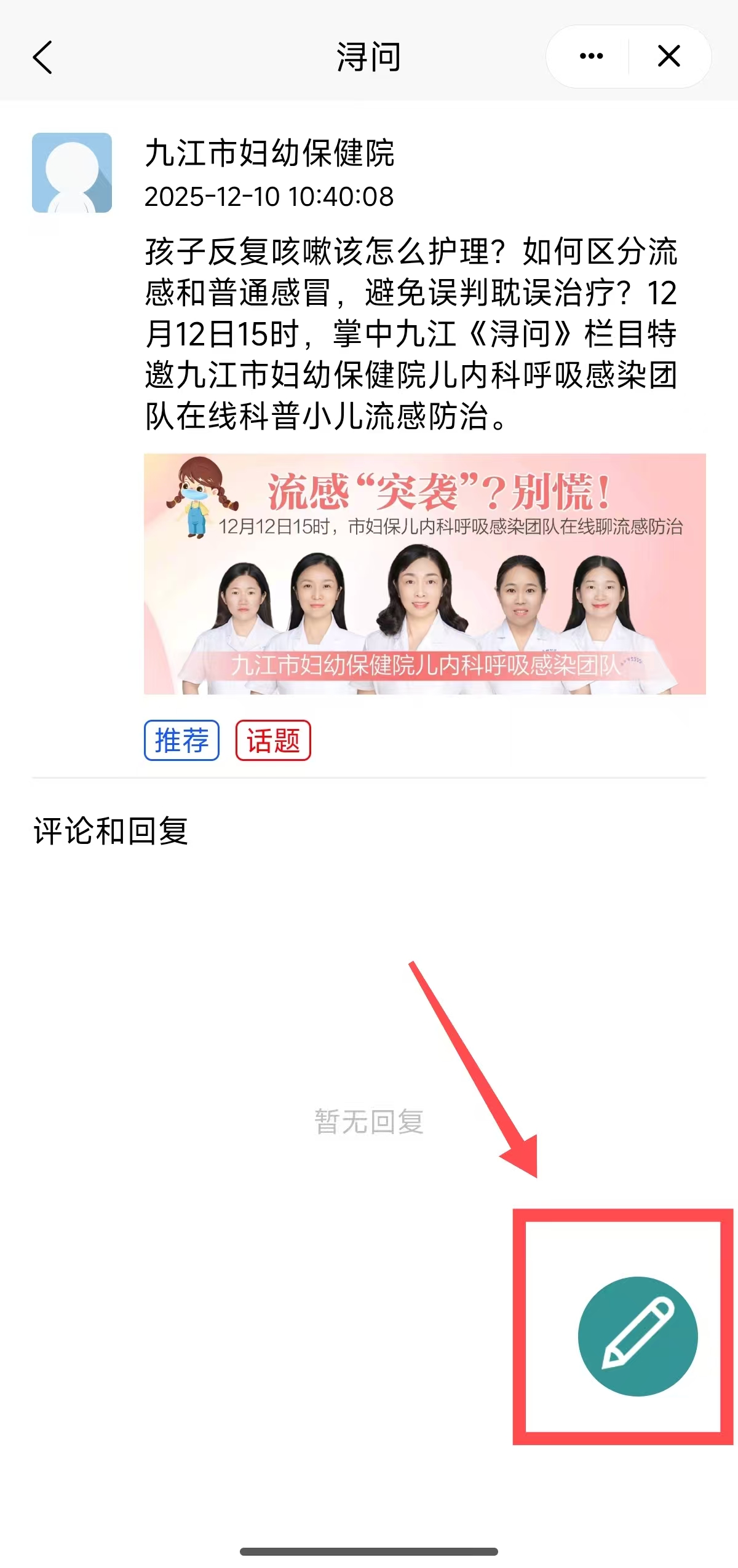 12月12日15时,掌中九江《浔问》栏目特邀九江市妇幼保健院儿内科呼吸感染团队在线科普小儿流感防治。
