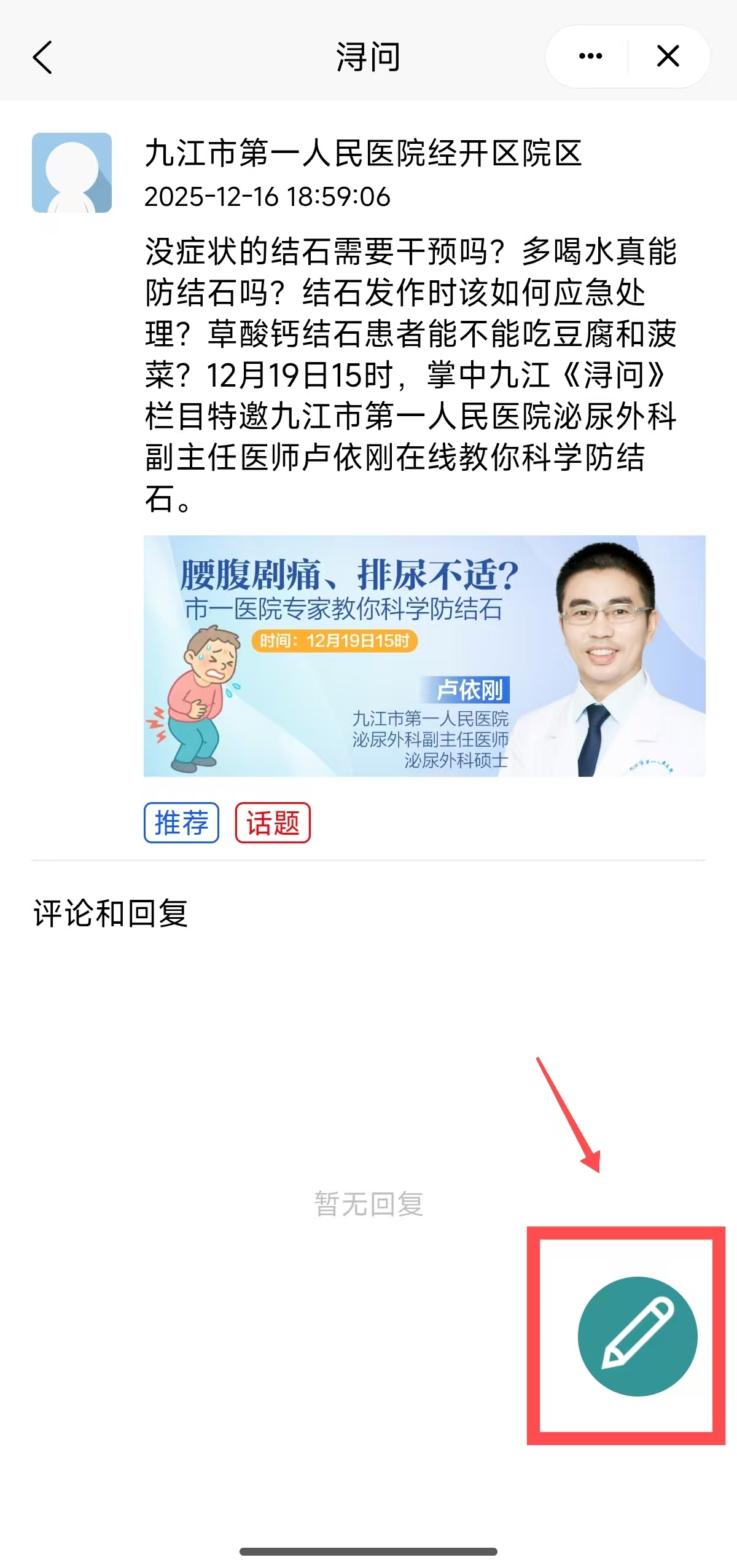 12月19日15时,掌中九江《浔问》栏目特邀九江市第一人民医院泌尿外科副主任医师卢依刚在线教你科学防结石。
