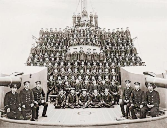 “海琛”号防护巡洋舰官兵在舰艏甲板合影。