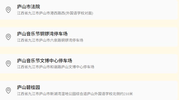 1.庐山市法院西侧、庐山市铜锣湾、庐山市文博馆、碧桂园停车场停放九江方向过来的乐迷车辆: