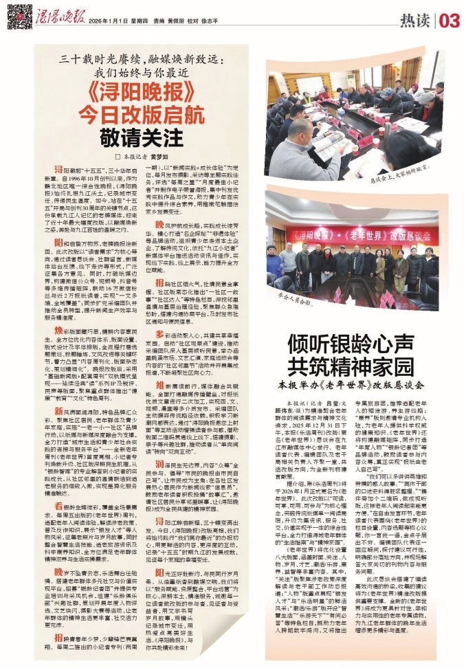 1月1日,《浔阳晚报》改版启航消息《三十载时光赓续,融媒焕新致远:我们始终与你最近》重磅刊发后,立刻在读者群体中引发热烈反响。微信公众号后台瞬间涌入大量留言,字里行间满是老读者的关注与牵挂。“新版面新征程,这份有温度的报纸,满心期待!”“三十年焕新启航,未来可期!”有读者深情寄语“元启新岁心闻新浔阳,老骥新声福满新晚报”,更有读者认可晚报“有态度、有温度、有深度”的内容定位,点赞晚报搭建对话平台、推动问题解决的价值,直言“多年一路关注,愿越办越好”。读者黎璇如的留言尤为动人:“三十载春华秋实,感恩您一直都是离我最近的心。那些年的无处诉说、那些月的意气风发、那些日的斗转星移,一一被您承载。唯愿君心似我心,携手再度三十载!”这一句句情真意切的祝福,一声声发自肺腑的期许,汇聚成这份老牌地方报纸焕新出发的澎湃动力。