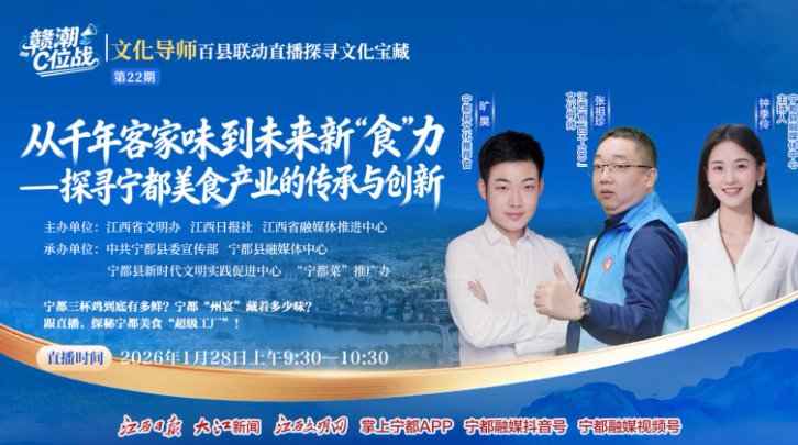 传统名菜“三杯鸡”的三杯到底是哪三杯?当千年客家味遇上现代新“食”力,会碰撞出怎样的火花?满山奔跑的宁都黄鸡,一天究竟要走多少步?1月28日上午9时30分,“赣潮C位战”文化导师百县联动直播第22期走进宁都县,江西省“四个100”文化导师张祖珍携手宁都县融媒体中心主持人钟季伶、宁都县文化推荐官旷昊,开启一场色香味俱全的文化探寻直播。