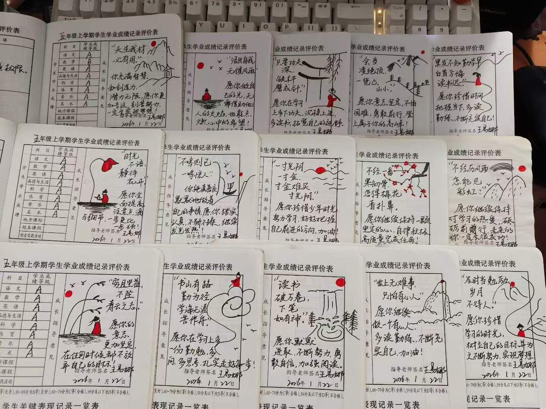 戴家埔中心小学校长黄小明介绍,该小学不止一位像王易娜这样的老师,还有老师用上了贴纸、水彩画为评语点缀,甚至模仿了黄历的形式,委婉点明孩子们的优缺点,鼓励孩子们更进一步。“这些老师都很用心,我们也倡导鼓励式教育,尽可能去发现孩子们的闪光点,”早在一周前,在看到老师们的特别评价语后,黄小明特地在深夜发了个朋友圈,附言“给老师们点赞!”