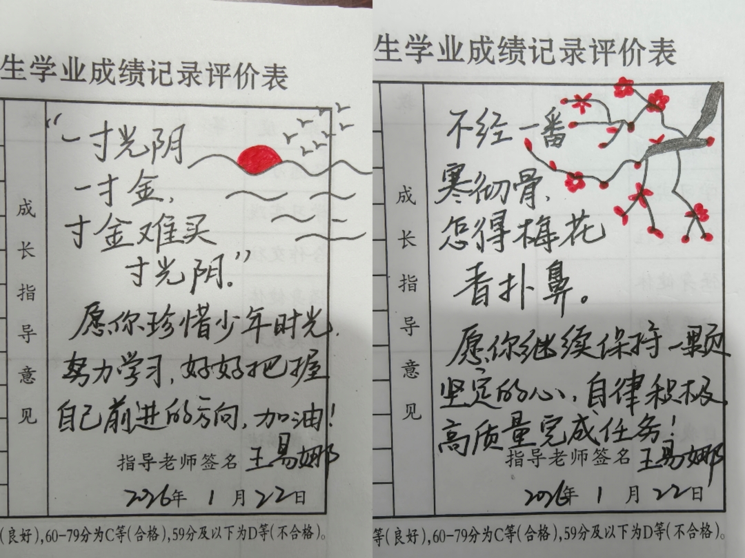 “少年应有鸿鹄志,当骑骏马踏平川,愿你继续努力,在任何情况下都不放弃自己的凌云志”……一句名言,搭配国风简笔画和一句温情寄语,1月28日,江西吉安遂川县戴家埔中心小学30多名学生,从00后班主任王易娜手中接过一张张“国风诗画版”的期末评价,开心极了!