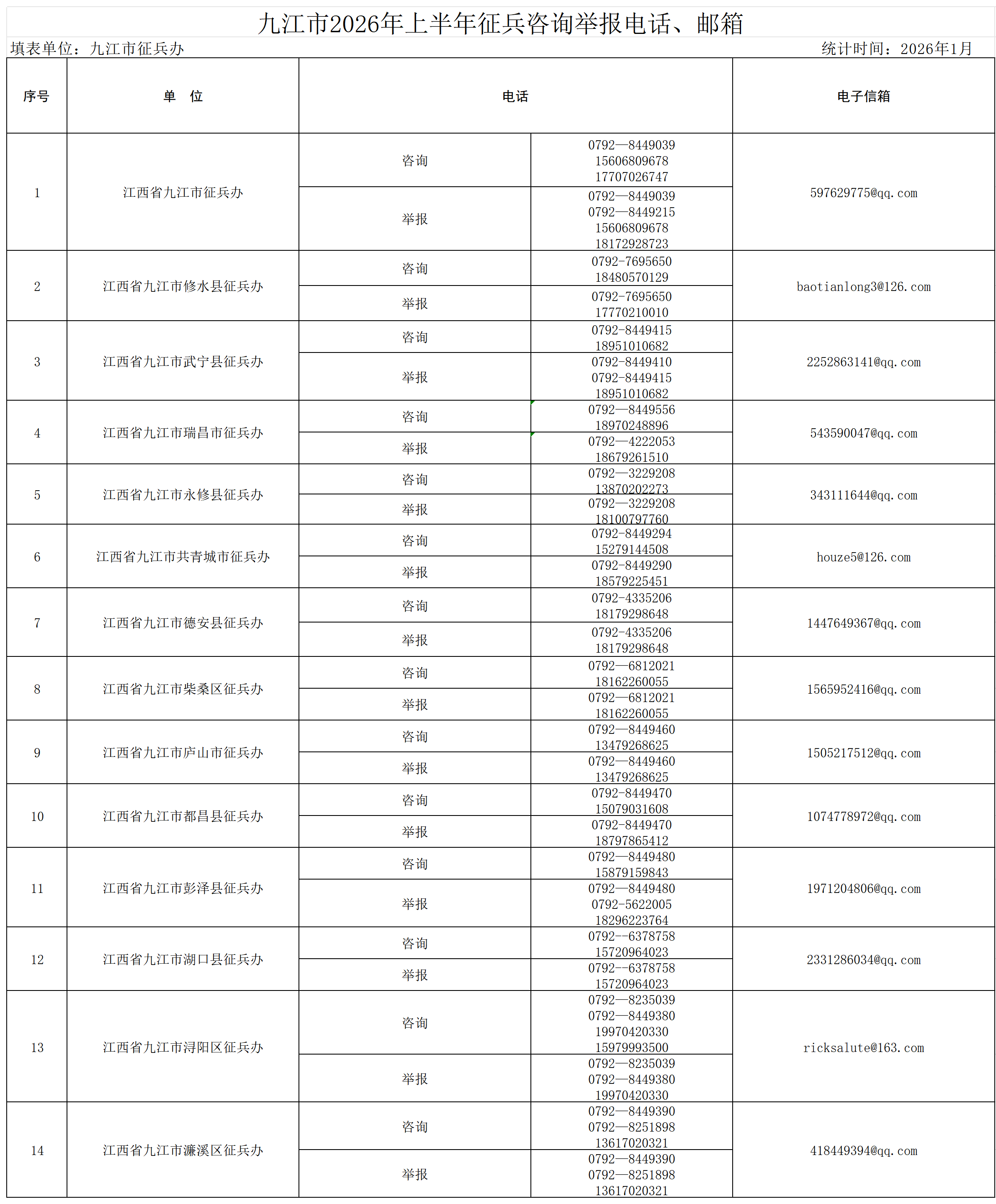 九江市2026年上半年征兵咨询举报电话、邮箱