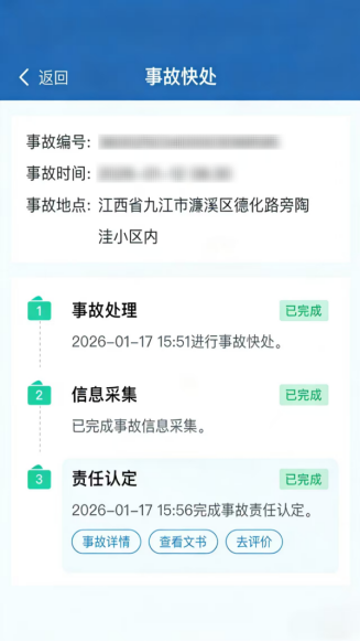 聚焦便民利民核心,人保财险九江市分公司依托“交管12123”APP“视频快处”功能,打造“快速接警、即时撤场、线上定责、理赔跟进”无缝衔接服务闭环,实现轻微事故快处办结“一通电话、一次办结”。事故发生后,当事人一键发起视频连线,按系统指引完成现场拍摄;交警在线定责并快速出具电子责任认定书,同步引导当事人进入在线理赔程序;人保理赔专岗实时跟进,自动调取事故影像、责任认定等资料,全程无需群众额外提交材料,理赔进度手机端可查、可溯。理赔时效实现大幅提升,从以往最快当天理赔完毕,压缩至最快2小时直赔到账,切实为群众节省时间成本。