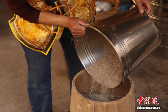 曾绍坤将过滤好的黄元柴灰水与蒸煮好的大禾米混合。 熊锦阳 摄