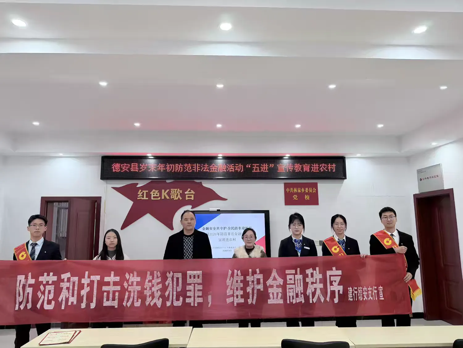 岁末年初是非法金融活动高发期,为切实守护农村居民的“钱袋子”,践行国有大行社会责任,中国建设银行德安支行(以下简称“建行德安支行”)联合德安县金融服务中心,深入林泉乡开展防范非法金融活动“五进”宣传教育活动,以专业力量为乡村金融安全注入“建行温度”。