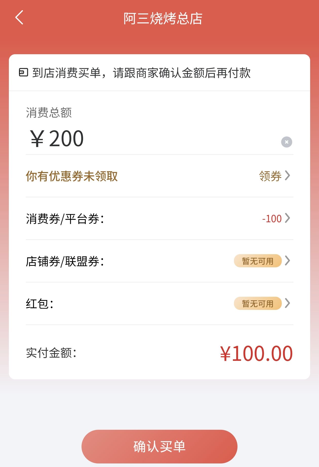 2.进入活动商家主页,点击到店付,输入消费金额,消费券将默认勾选,点击确认买单,即可抵扣。(该券不可用于烟酒消费)