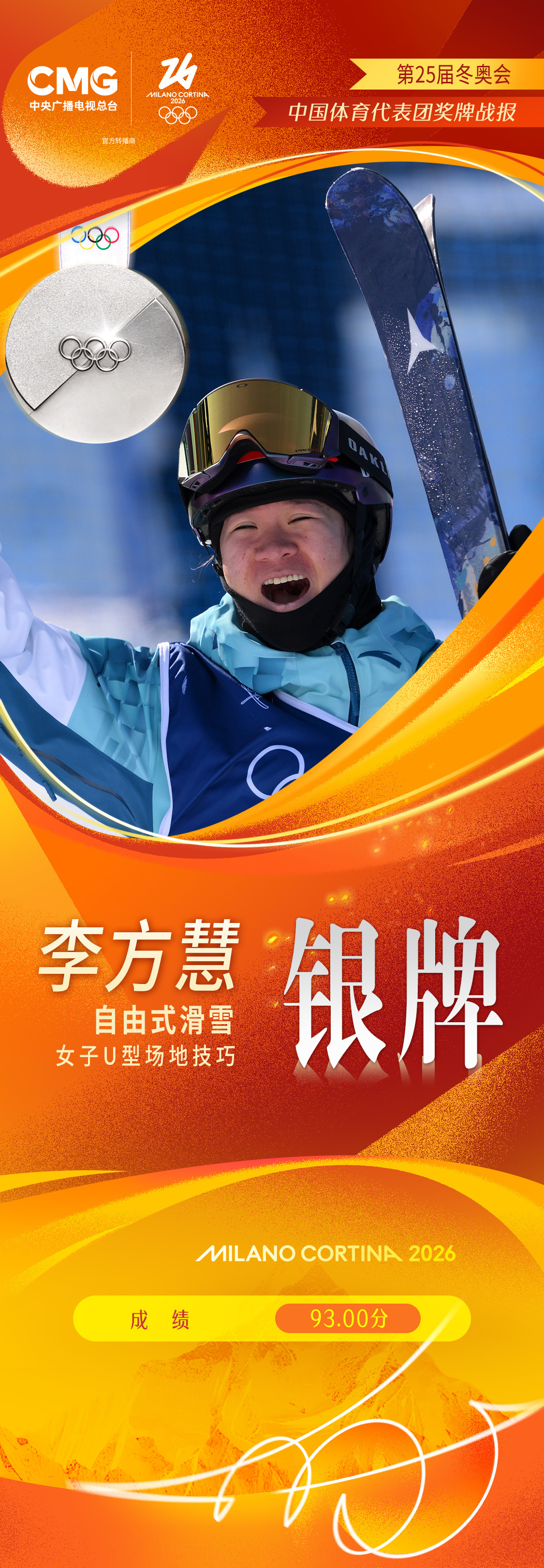米兰-科尔蒂纳冬奥会,自由式滑雪女子U型场地技巧决赛,中国选手谷爱凌夺得金牌,李方慧获得银牌。中国队包揽金银!