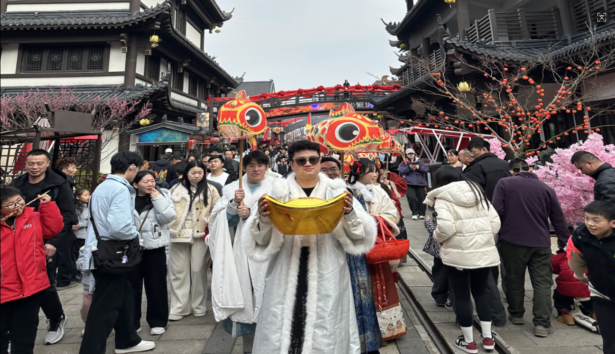 沉浸式新春体验亮点纷呈。全体员工身着古风服饰化身NPC巡游送福,莲语小剧场精彩上演,有效带动住宿、餐饮等二次消费,成为增收亮点。景区联动商户、市集、美食节摊位,建立数据收集与问题协调机制,实现景区与商户共赢。同时,便民服务站、临时医疗点、暖心物资等服务全覆盖,高效处置游客求助与突发情况,游客满意度达100%。