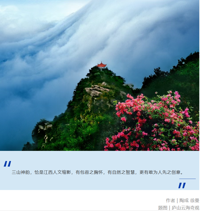 庐山、三清山、龙虎山不仅是著名的旅游目的地,更是生态保护、文化传承和绿色发展的鲜活典范。透过三山神韵,可以看到江西厚实的绿色家底与卓绝的人文风华。