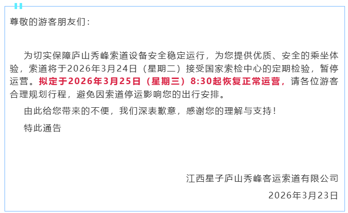 庐山秀峰索道发布通告