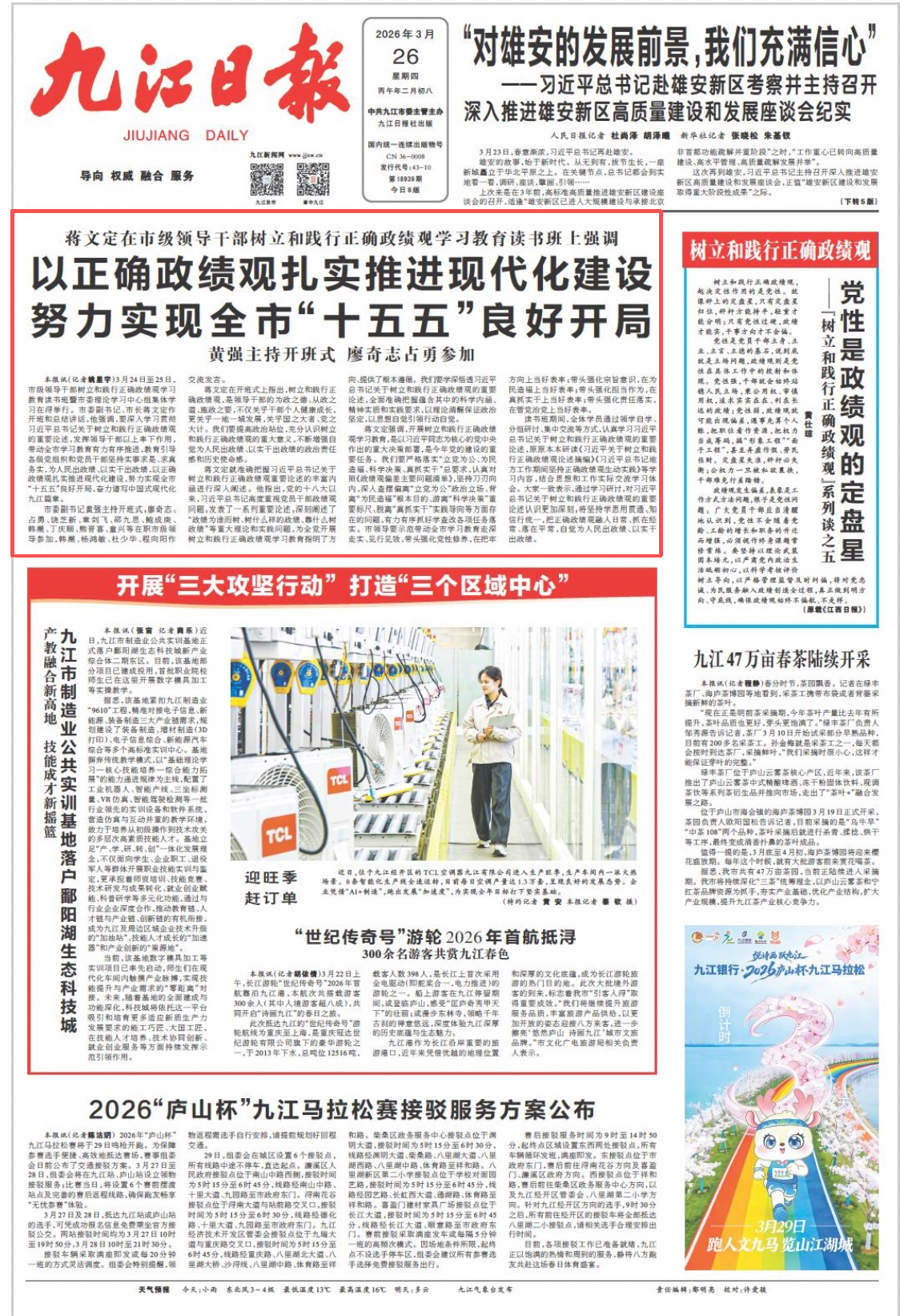 3月24日至25日,市级领导干部树立和践行正确政绩观学习教育读书班暨市委理论学习中心组集体学习在浔举行。市委副书记、市长蒋文定作开班和总结讲话,他强调,要深入学习贯彻习近平总书记关于树立和践行正确政绩观的重要论述,发挥领导干部以上率下作用,带动全市学习教育有力有序推进,教育引导各级党组织和党员干部坚持实事求是、求真务实,为人民出政绩、以实干出政绩,以正确政绩观扎实推进现代化建设,努力实现全市“十五五”良好开局,奋力谱写中国式现代化九江篇章。