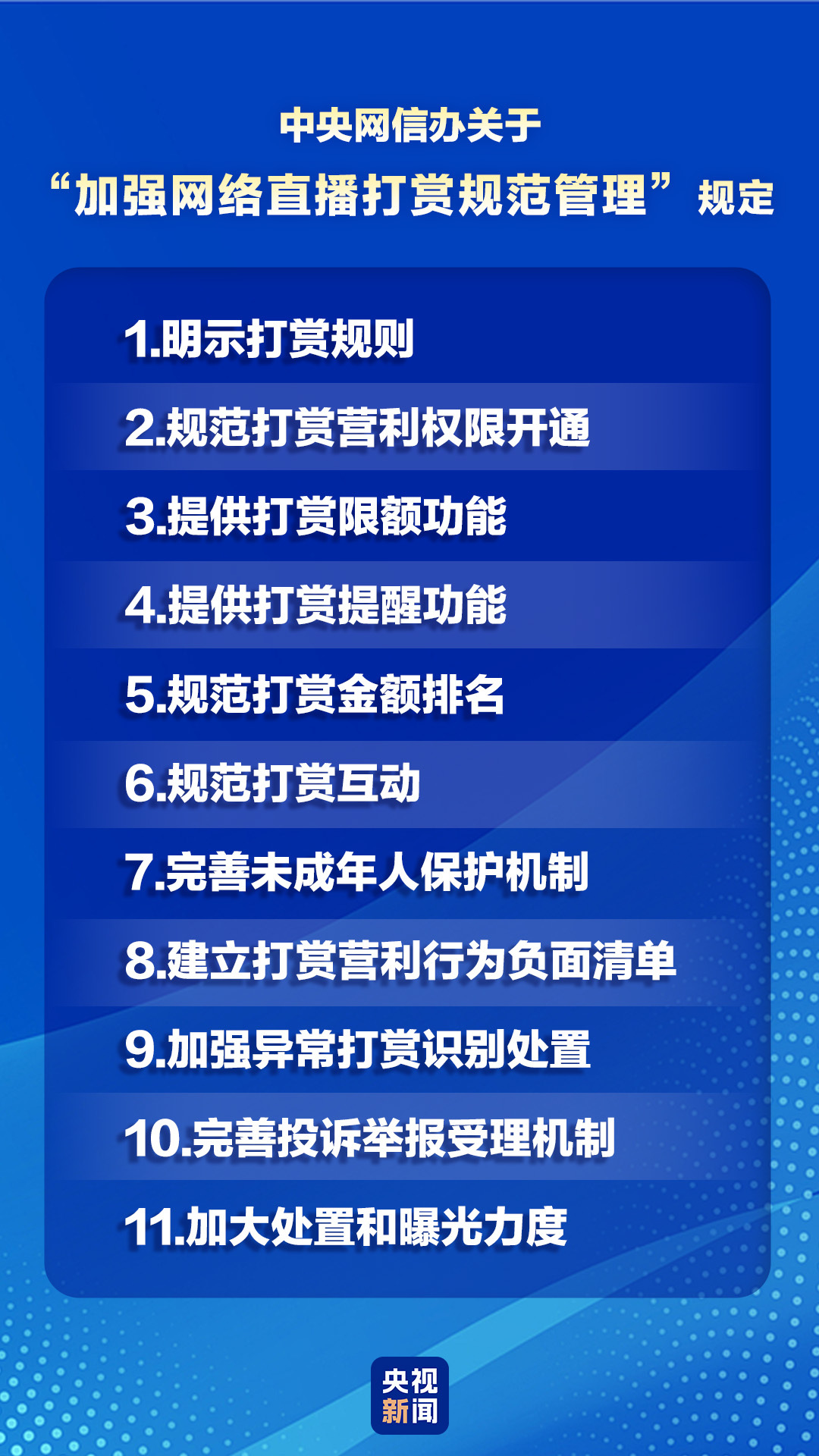 为进一步加强网络直播打赏管理,规范网络直播营利行为,推动网站平台合规健康运营,切实维护网民合法权益,现就有关工作要求通知如下: