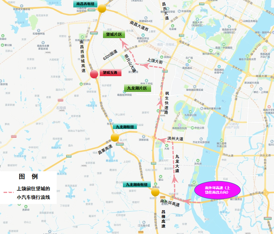 3.上饶往南昌方向:南外环高速→九龙湖南枢纽→九龙湖枢纽→昌栗高速→西山枢纽→西山北互通→西山北收费站→G320国道→望城片区
