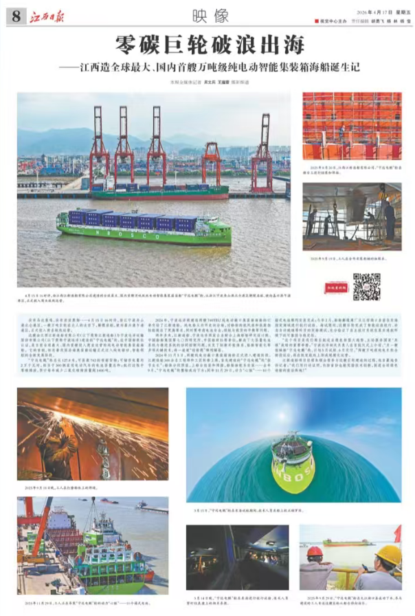 2024年11月5日,两艘纯电动敞口集装箱海船正式进入建造阶段。江新造船300余名工程师和工匠轮番上阵,首先建造的“宁远电鲲”轮“拔节生长”:船体分段预装,上船台组装和焊接,船舶轴舵系安装……去年9月,“宁远电鲲”轮整船成功下水;同年11月29日,动力“心脏”——10个箱式电池顺利安装完成;今年2月,船舶解缆离厂从江西湖口县前往东海指定海域进行航行试验。海试期间,这艘巨轮完成了智能巡迹航行、动态自动避碰等科目的实船测试,充分验证了自主航行系统在真实通航环境下的可靠性与稳定性。