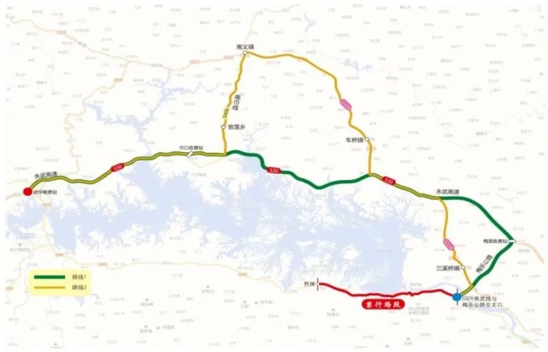 焦武公路与梅乐公路交会处→梅乐公路高速连接线与G316交叉路口→三溪桥→白水→南义→巾口高速收费站→武宁高速收费站。